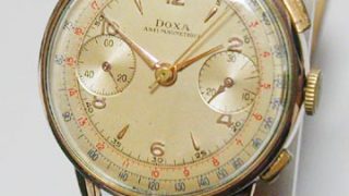 ドクサ ドクサ クロノグラフ 1940年代 Doxa Chronograph GF&SS 35mm 手巻き通好みなブランドのドクサのクロノグラフです。文字盤の状態はとても良いです。ケースはGFですがピンクゴールド系で、金色の文字盤とともに、けっこうゴージャスに見える時計... 2018.01.01 ドクサ